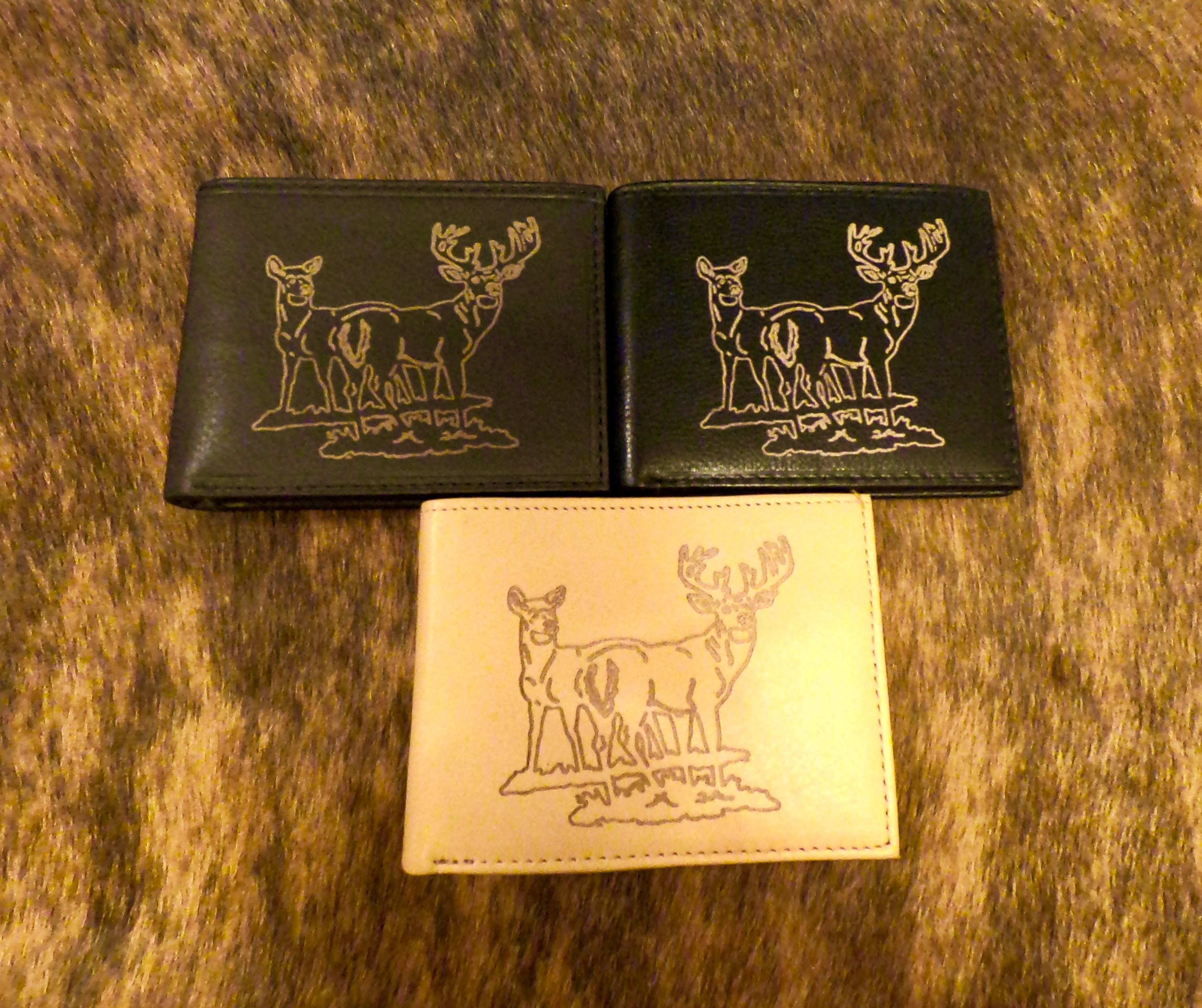 A hand crafted leather wallet. Includes card slots, ID window, double pocket for cash, and a laser engraved design on it.