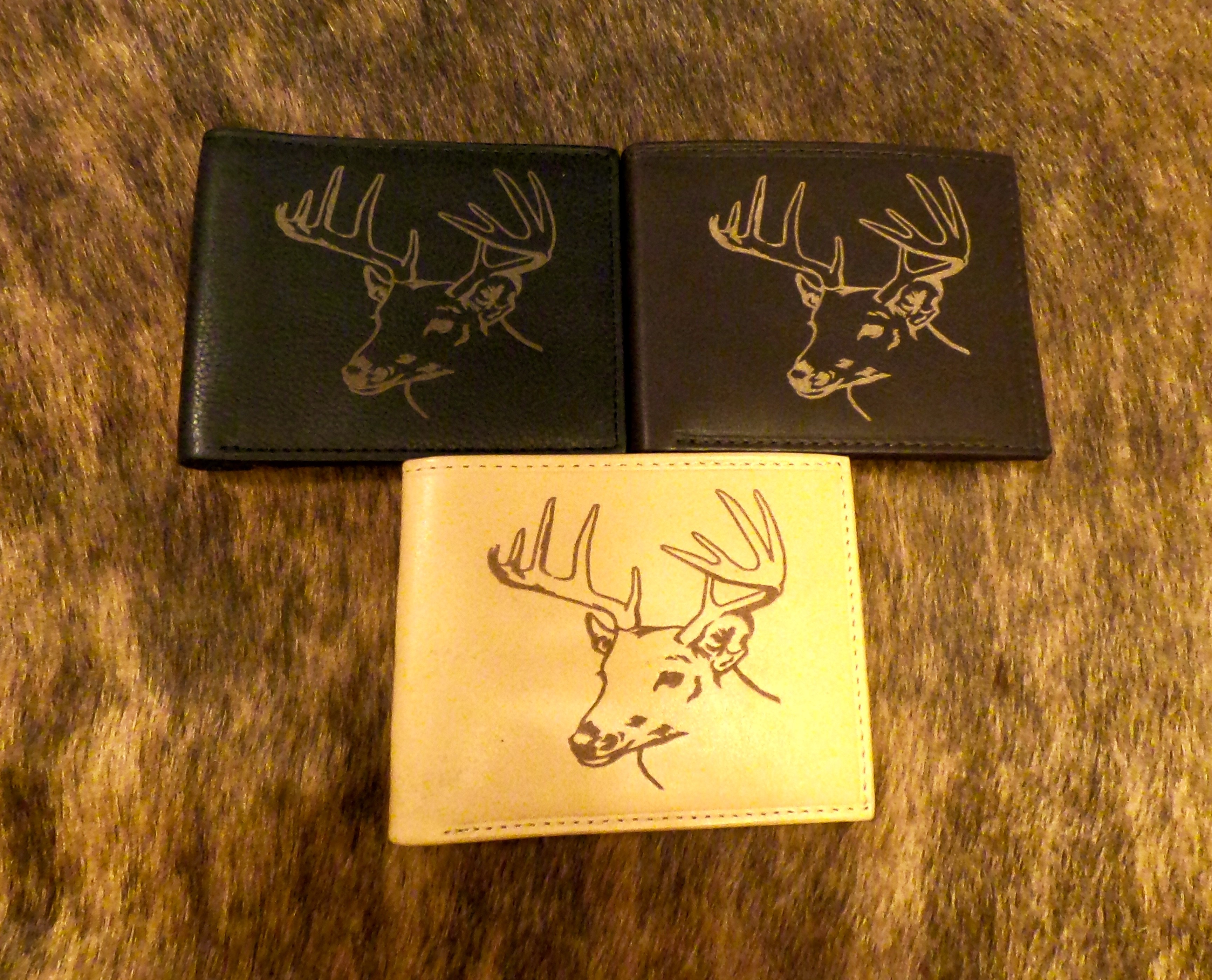 A hand crafted leather wallet. Includes card slots, ID window, double pocket for cash, and a laser engraved design on it.