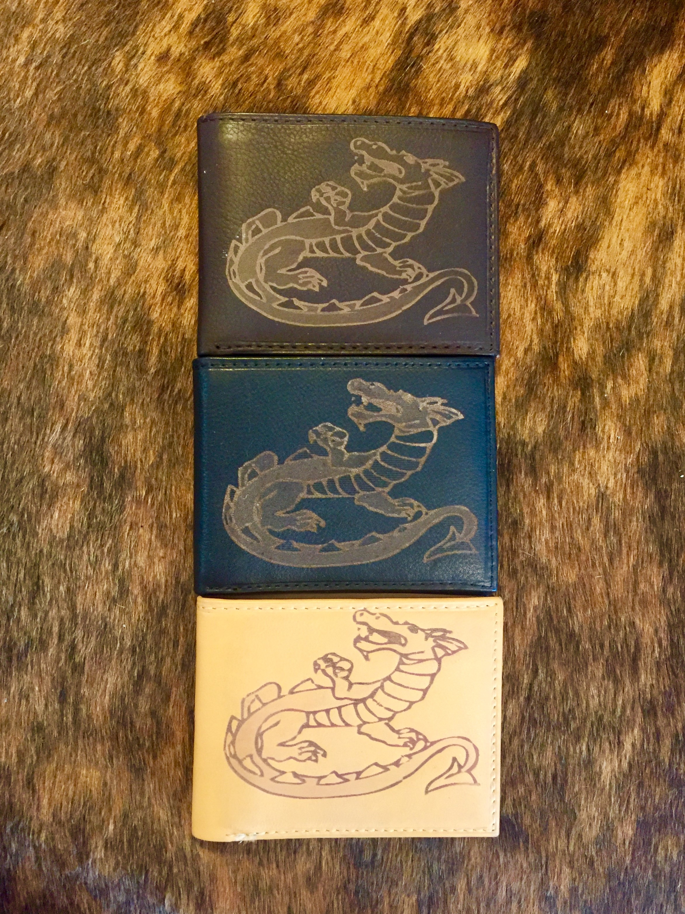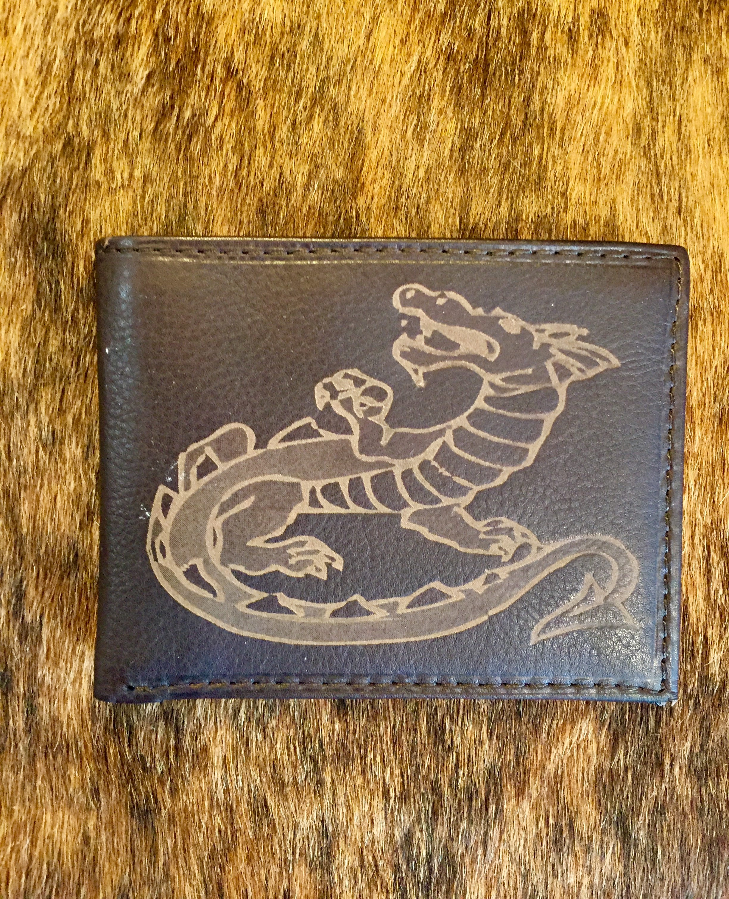 A hand crafted leather wallet. Includes card slots, ID window, double pocket for cash, and a laser engraved design on it.