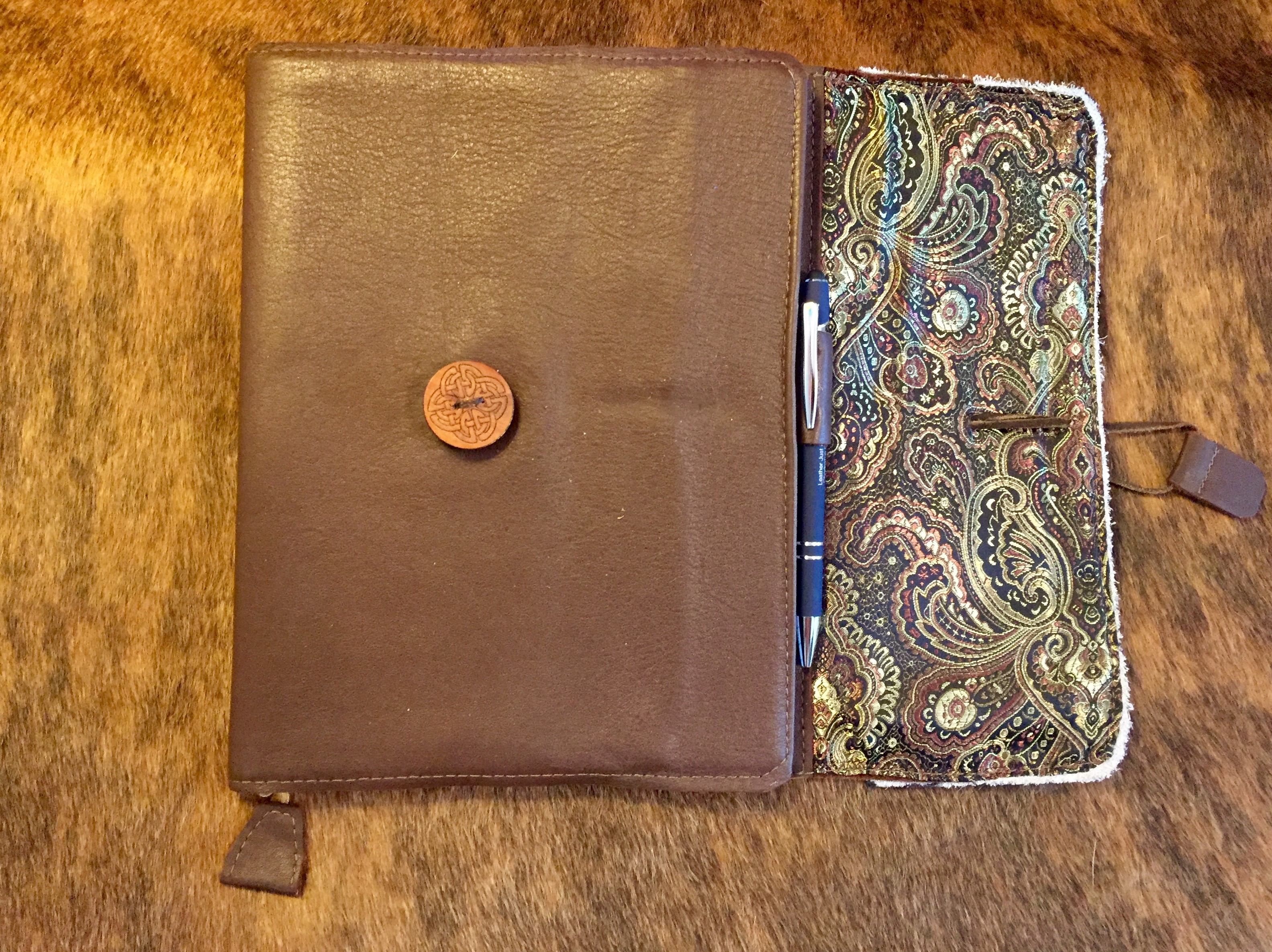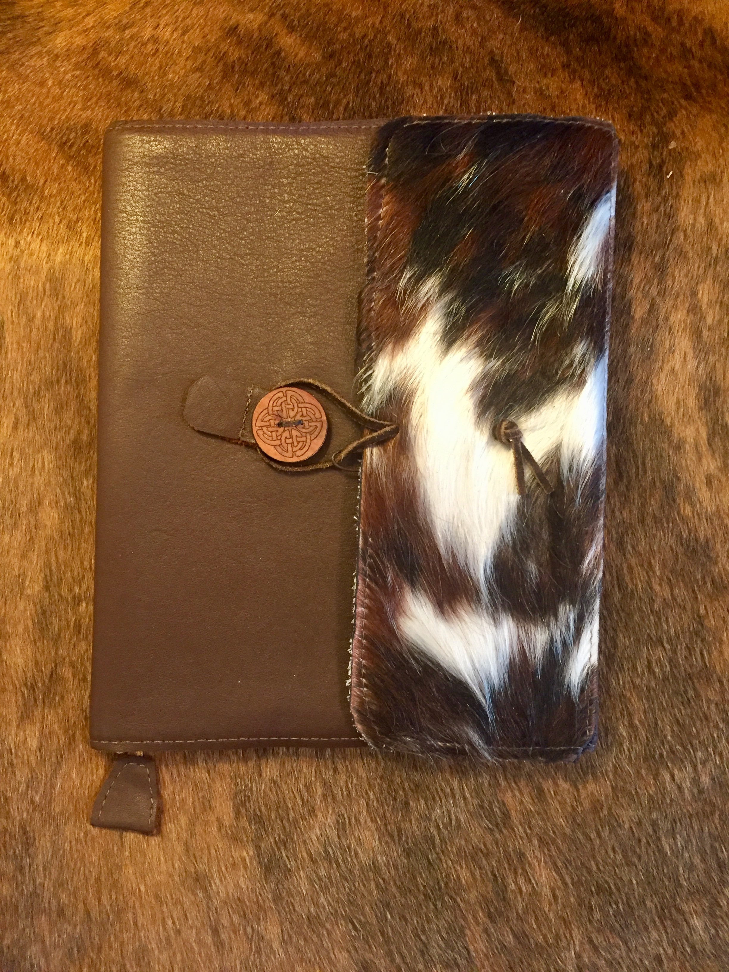 This is a Large journal fitting a black and white composition journal. This journal sports a patch of hair on hide to add character and a unique look. Comes with book mark and pen holder.
