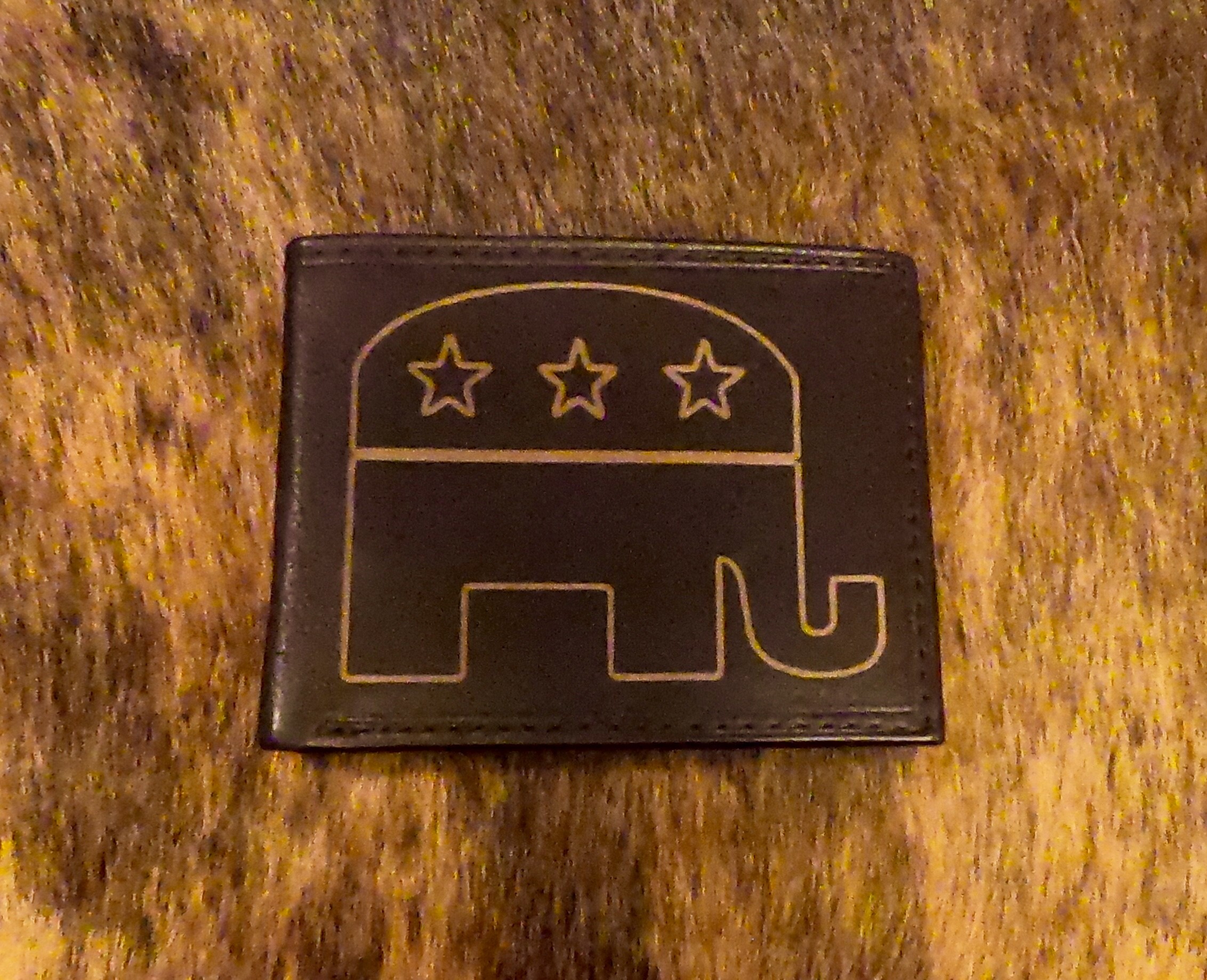 A hand crafted leather wallet. Includes card slots, ID window, double pocket for cash, and a laser engraved design on it.