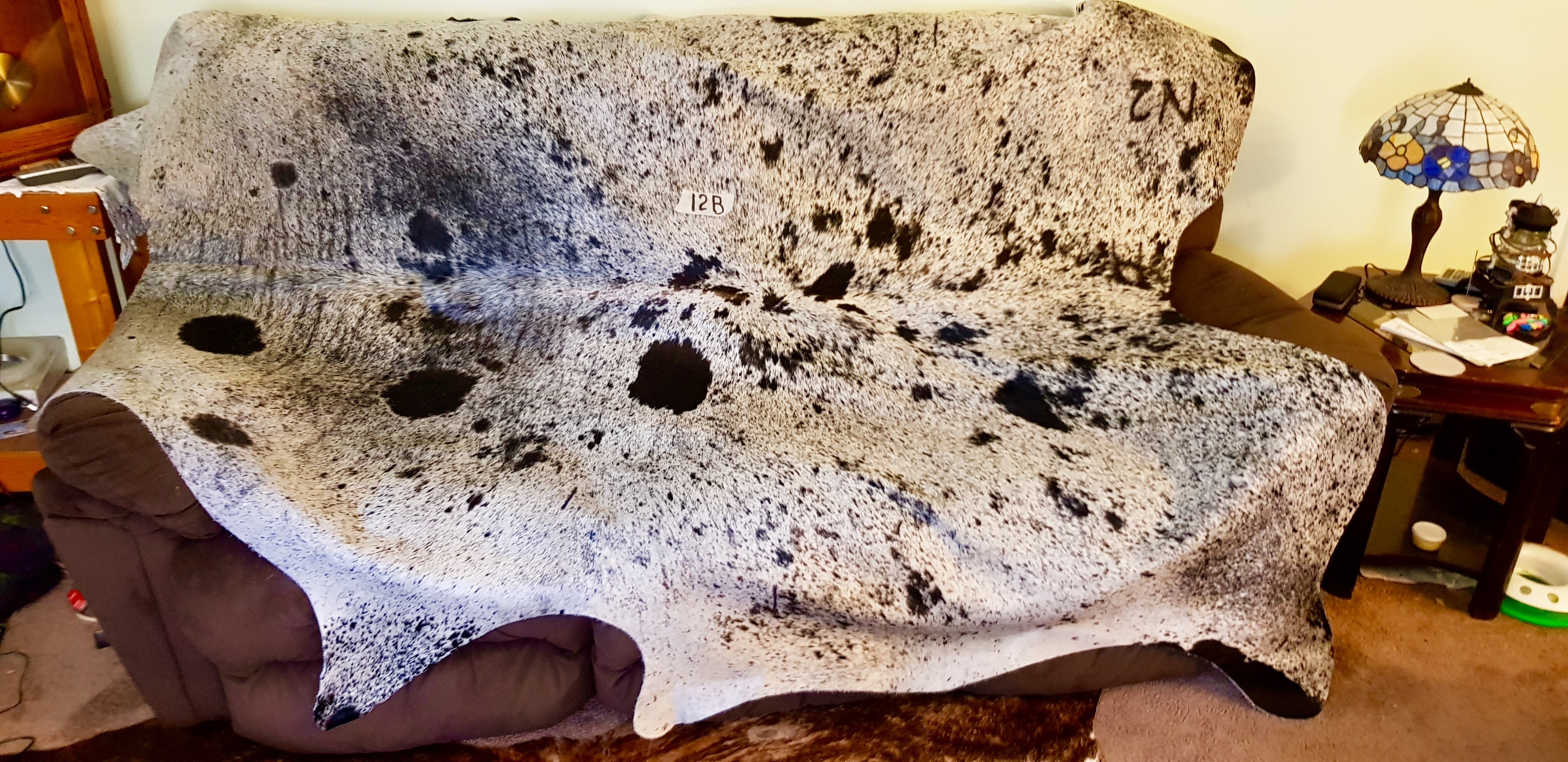 Product Description A short haired hide that has mainly black and white spots with a few sporadic dark chocolate spots.